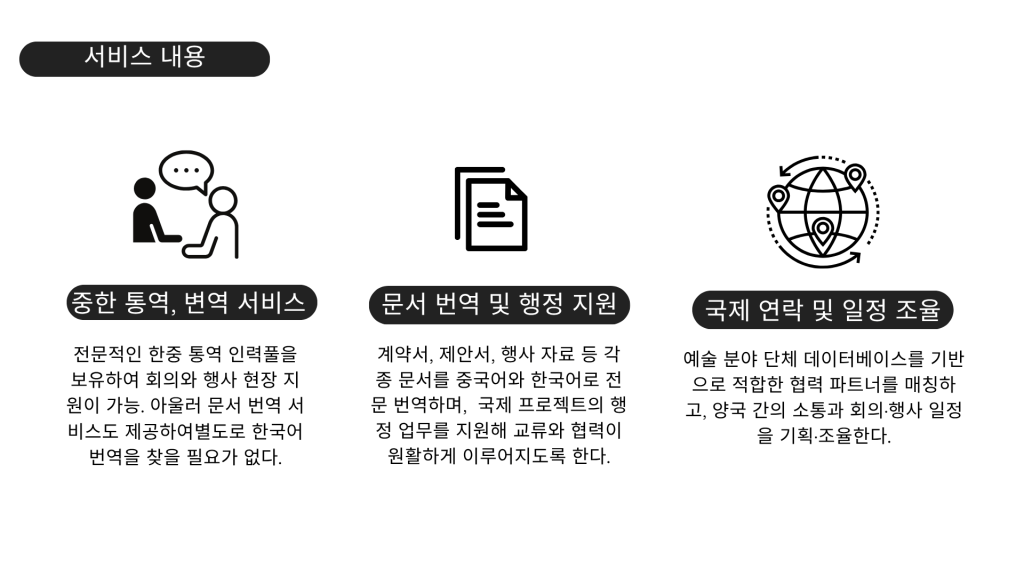 음악·공연예술·문화콘텐츠·지역활성화를 핵심으로 대만과 한국의 예술·문화 산업을 연결하고 있다. 예술 매개, 번역, 행정 지원, 국제 교류 서비스를 제공하며, 양국 창작자와 기관을 위한 이 시대의 문화적 다리를 만들어 간다.